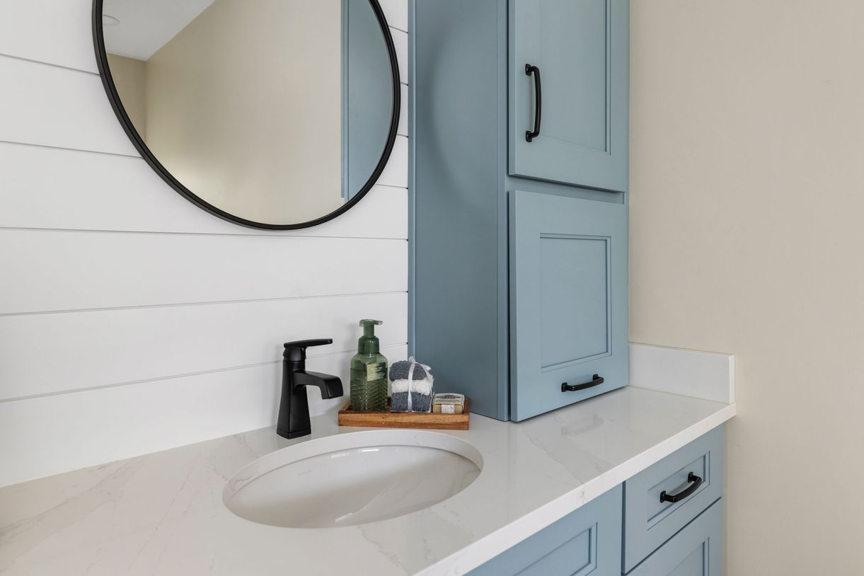 To balance the playful Aqua cabinetry, the remodel incorporates high-end stone and contrasting hardware to ground the space in modern elegance.